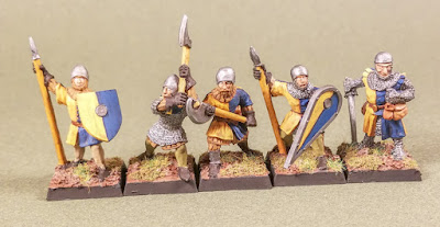 The Baron is leading some retainers, 33 points for him. 81 points for the other 9 men. I armed them with light armor, shields and spears.