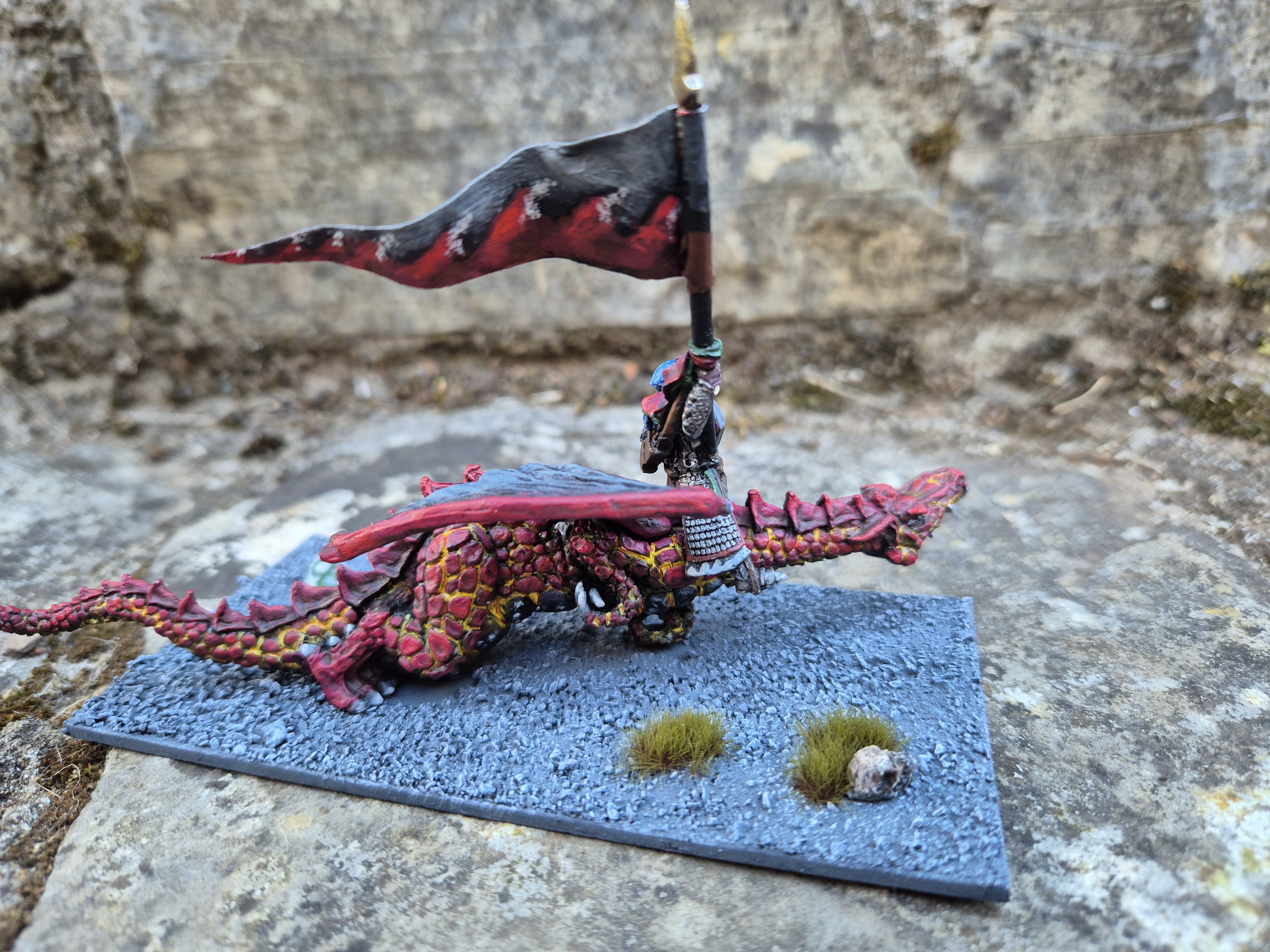 I painted up the dragon and rider prior to the start of the challenge, as both test and inspiration for the idea for my Darkish Elves. Now that the ideas are more fully formed I've gone back to add the shield and the banner to show the same emblem of the Dragon emerging from a sea of blood. This serves as both house emblem and a not so subtle dig at the new Caledor regime in Ulthuan.
